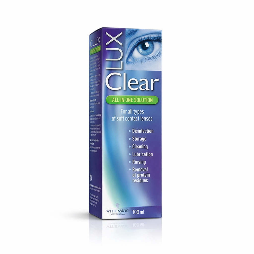 محلول CLUX Clear يأتي بحجم 100 مل متعدد الاستخدامات لتنظيف وتعقيم وحفظ العدسات اللاصقة اللينة. يساعد على إزالة ترسبات البروتين، ويوفر ترطيب وراحة للعين مع الاستخدام اليومي. مناسب لجميع أنواع العدسات اللاصقة.